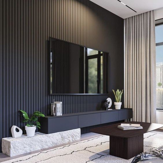 Charcoal louvers with crisp lines and deep tones—designed to bring modern definition and dimension to interior surfaces.