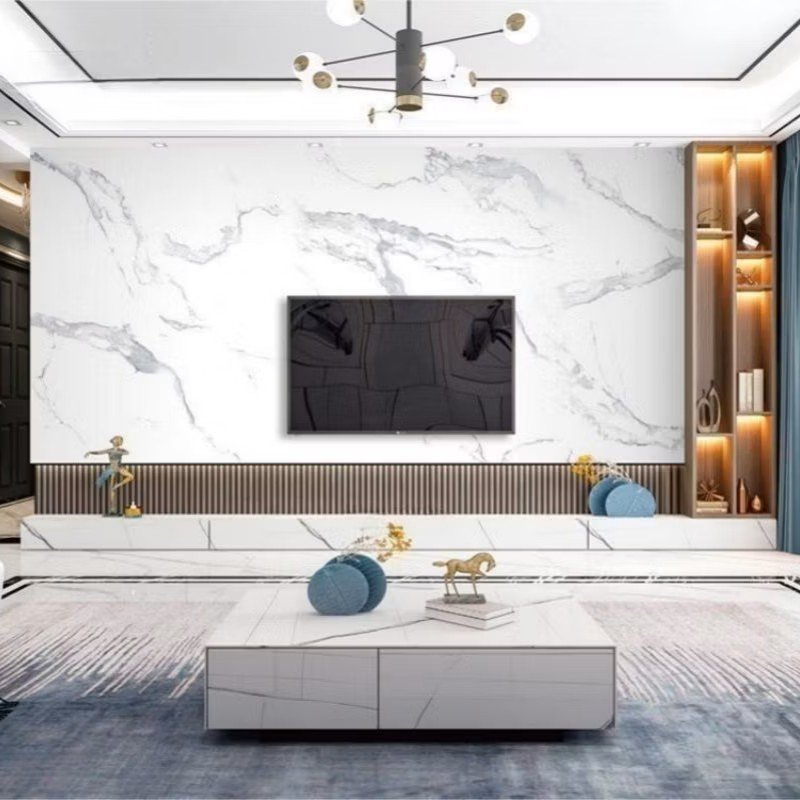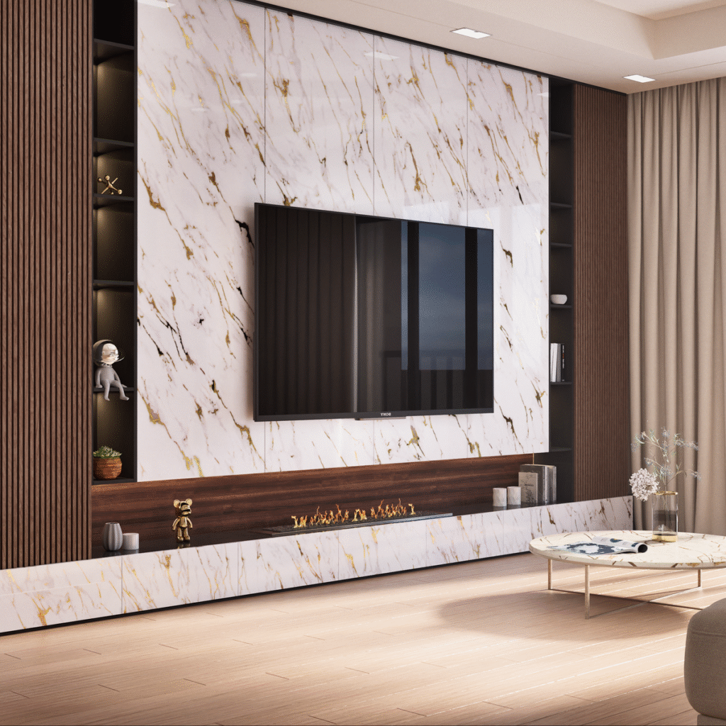High-shine UV marble sheets designed to bring clean lines and contemporary polish to walls, TV units, and beyond.